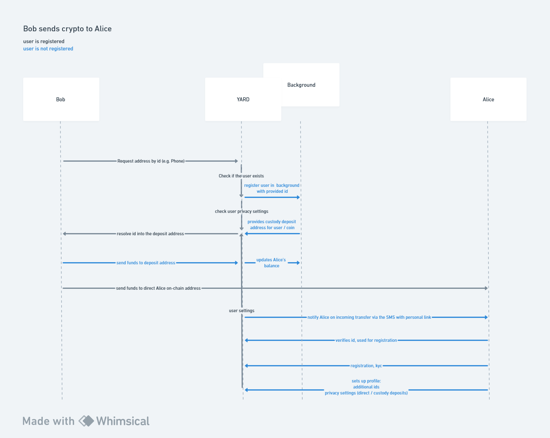 **YARD** functions as a transport layer, converting any recipient user identifier (credential) sender knows, whether it's a phone number, email address, or Telegram login, into a blockchain address where cryptocurrency can be send. It doesn't matter if the recipient is registered with the service, they can always access the funds by verifying ownership of the identifier to which the funds were sent. After verification, the cryptocurrency can be withdrawn to any user wallet.